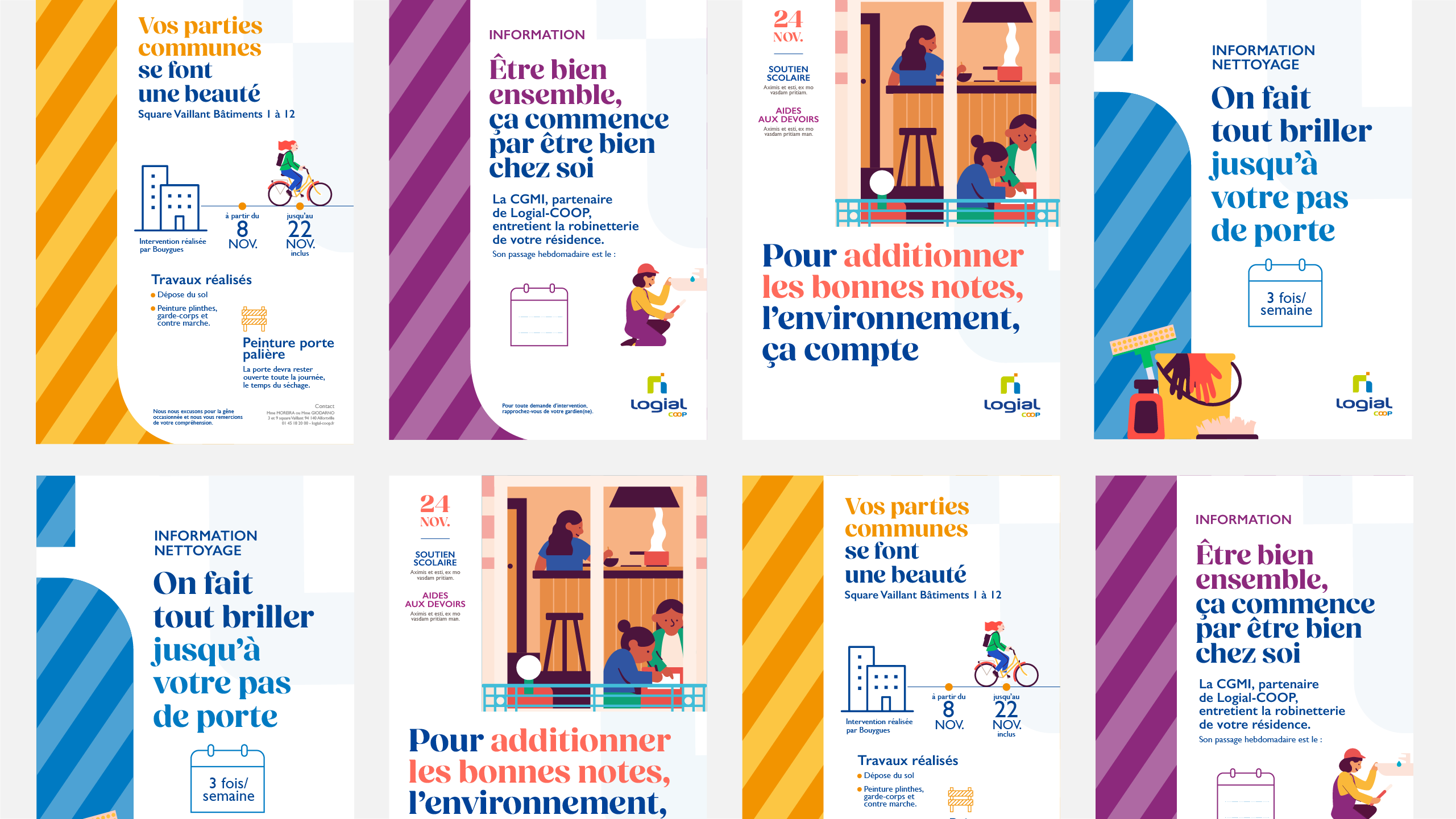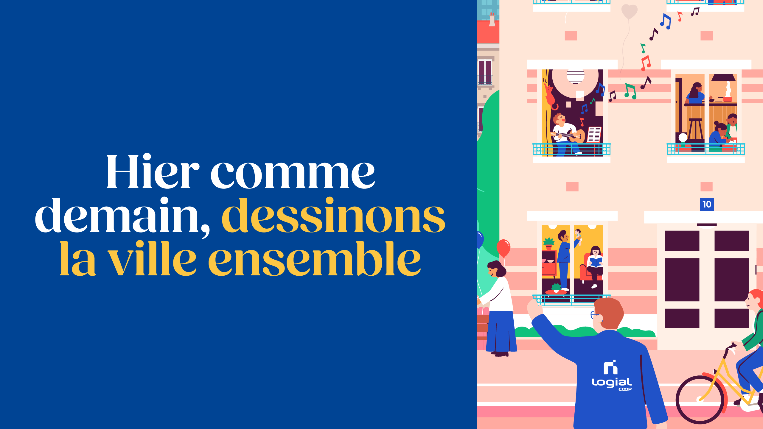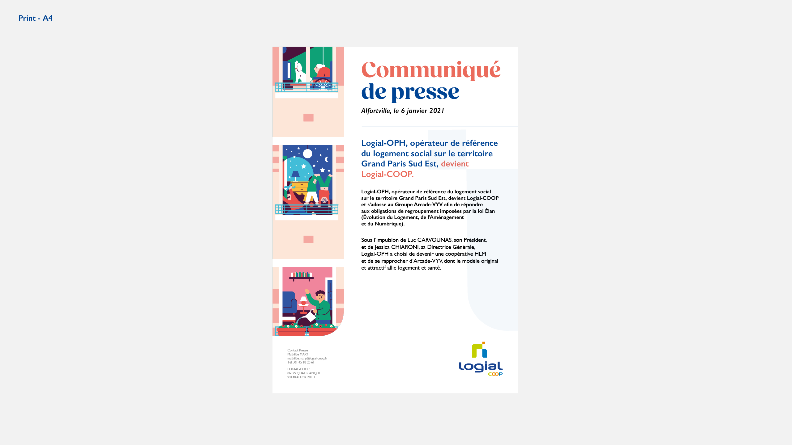 Logial-COOP, acteur majeur de l’habitat social dans le Val-de-Marne et l’Essonne réinvente sa plateforme de marque avec une nouvelle stratégie d’engagements et un territoire créatif repensé. J'ai eu l'opportunité de participer à cette transformation en travaillant sur la nouvelle identité visuelle de la marque et la refonte de sa charte graphique. L'illustration créée met en avant une série de scènettes qui capturent l’énergie et la diversité des interactions au sein de leurs résidences.