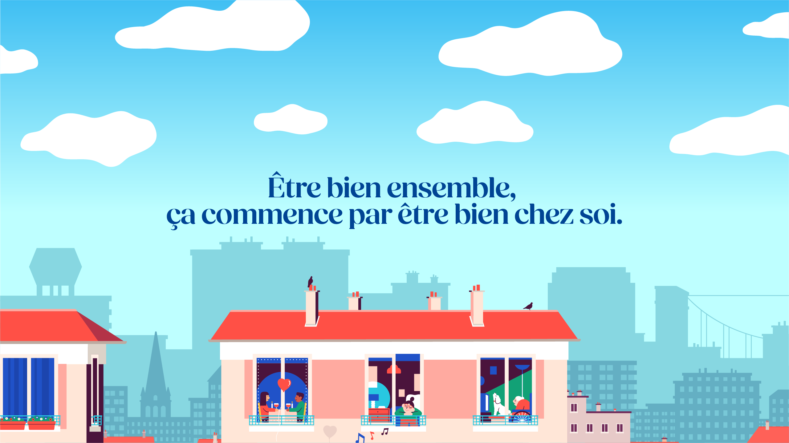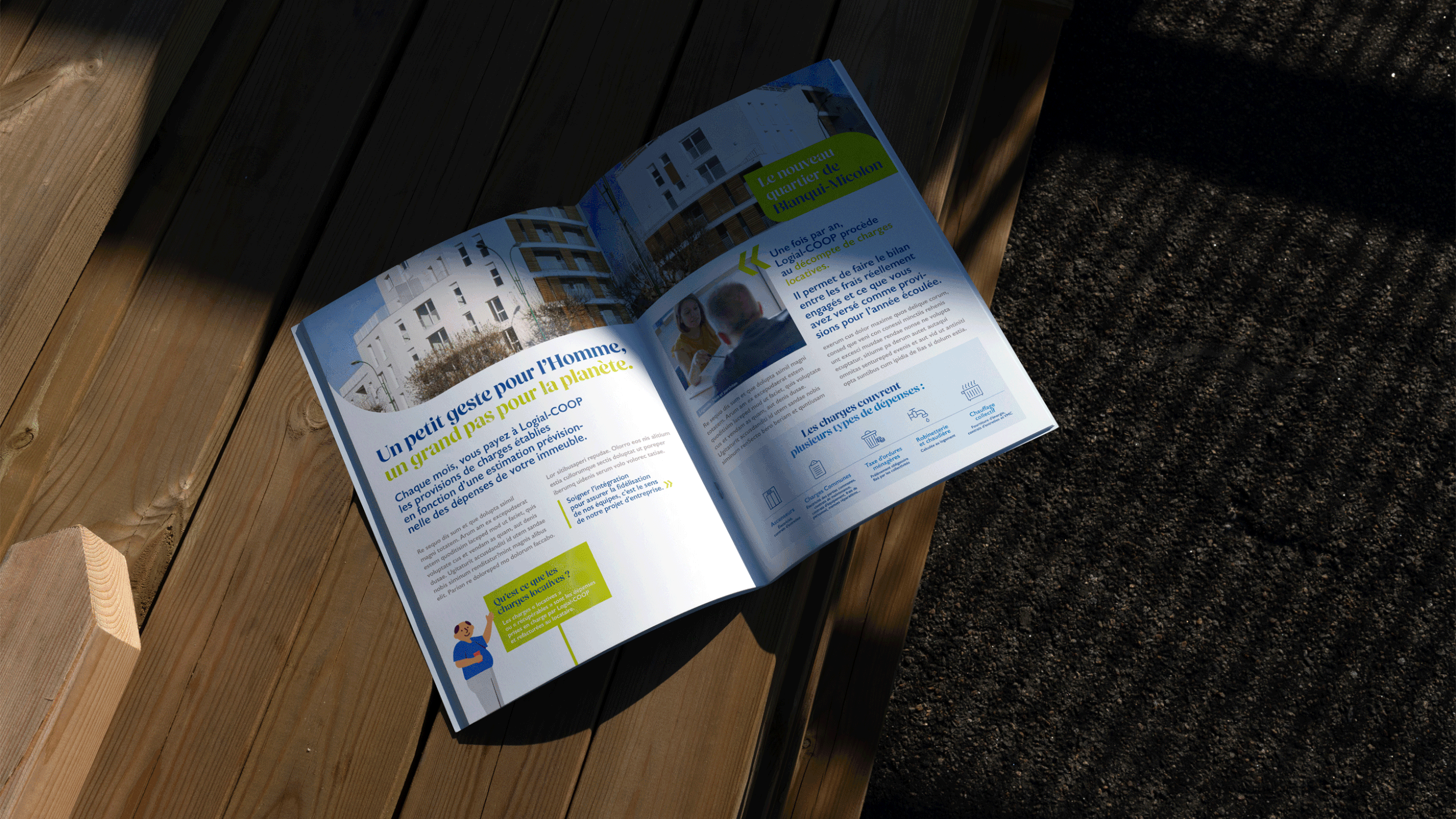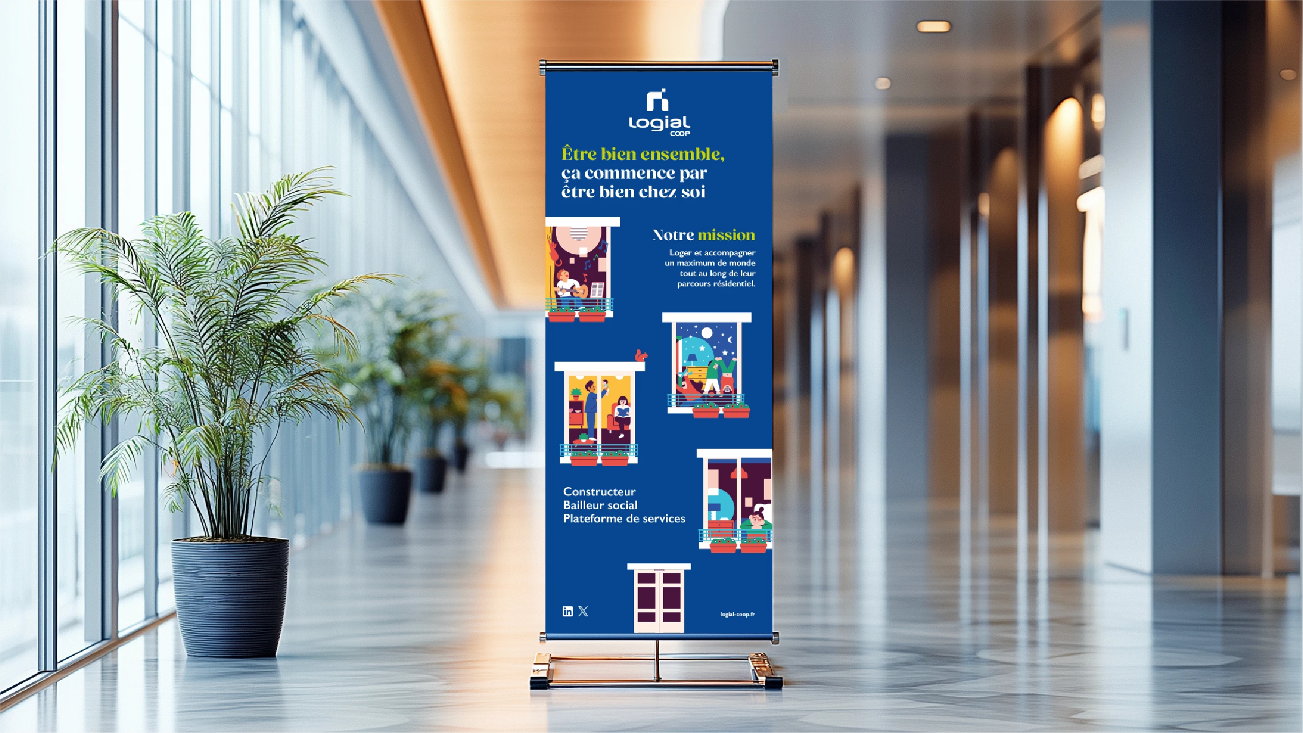 Logial-COOP, acteur majeur de l’habitat social dans le Val-de-Marne et l’Essonne réinvente sa plateforme de marque avec une nouvelle stratégie d’engagements et un territoire créatif repensé. J'ai eu l'opportunité de participer à cette transformation en travaillant sur la nouvelle identité visuelle de la marque et la refonte de sa charte graphique. L'illustration créée met en avant une série de scènettes qui capturent l’énergie et la diversité des interactions au sein de leurs résidences.